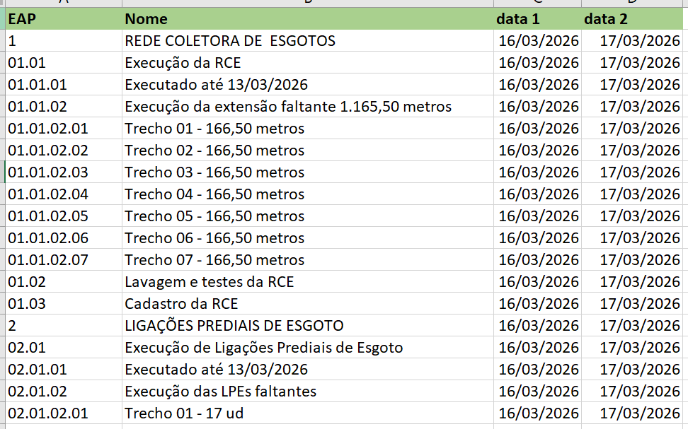 ⚠️ Importante: O arquivo Excel deve conter obrigatoriamente as colunas: EAP, Descrição/Tarefa, Data de Início e Data de Término. - Veja modelo nos anexos desse artigo.