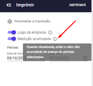 Ao imprimir um infográfico, é possível definir se os dados do PDF serão exibidos de forma acumulada ou não acumulada. Basta acessar a tela de medições, clicar em Imprimir infográfico e ativar ou desativar a opção Medição acumulada na janela de impressão.