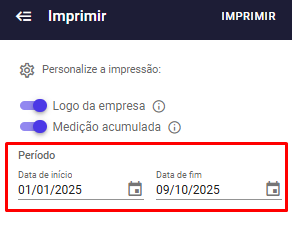 É possível gerar um único PDF com vários infográficos de um período específico. Na tela de medições, utilize a opção Exportar infográficos em massa, selecione o período desejado e defina se o arquivo deve considerar a opção Medição acumulada antes de gerar o PDF.