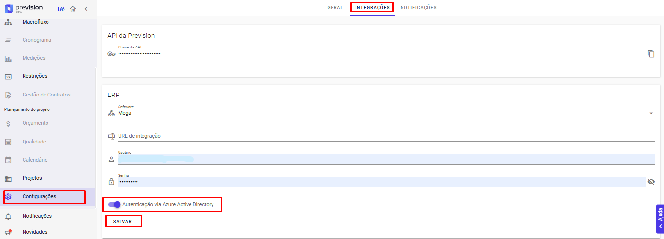 Para configurar a integração é necessário realizar o cadastro das credenciais no Prevision. No Menu lateral esquerdo, acesse a opção "Configurações" e selecione a opção "Integrações", conforme mostra a imagem a seguir: