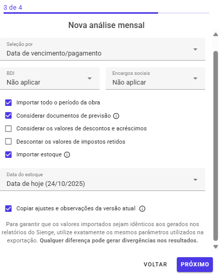 Lembrando que tudo o que for definido nesta etapa será exatamente o que será importado do Sienge. A Prevision não realiza o cálculo dos valores comprometidos - eles já vêm prontos do Sienge. Portanto, os valores entre Prevision e Sienge só serão iguais se as mesmas predefinições forem utilizadas na exportação manual do Sienge.
