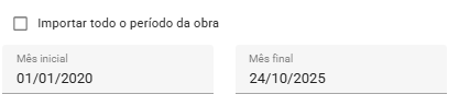 Trazer todo o período da obra: ao marcar esse checkbox, serão importados todos os documentos referentes a toda a obra. Caso não esteja marcado, é necessário definir manualmente o período desejado.