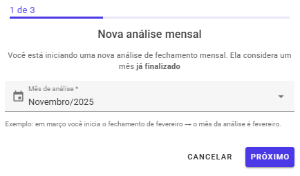 - Nova análise mensal: inicia um novo processo de fechamento, utilizado quando você vai começar a análise de um mês que já foi concluído (por exemplo, estamos em outubro e será feita a análise de setembro).
