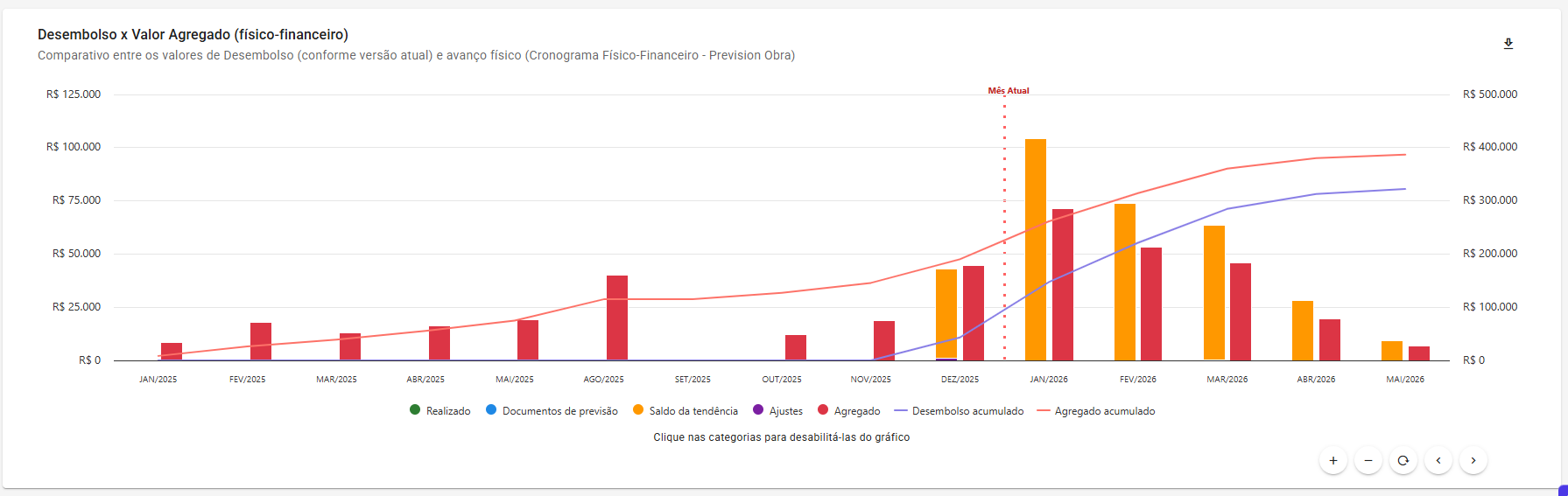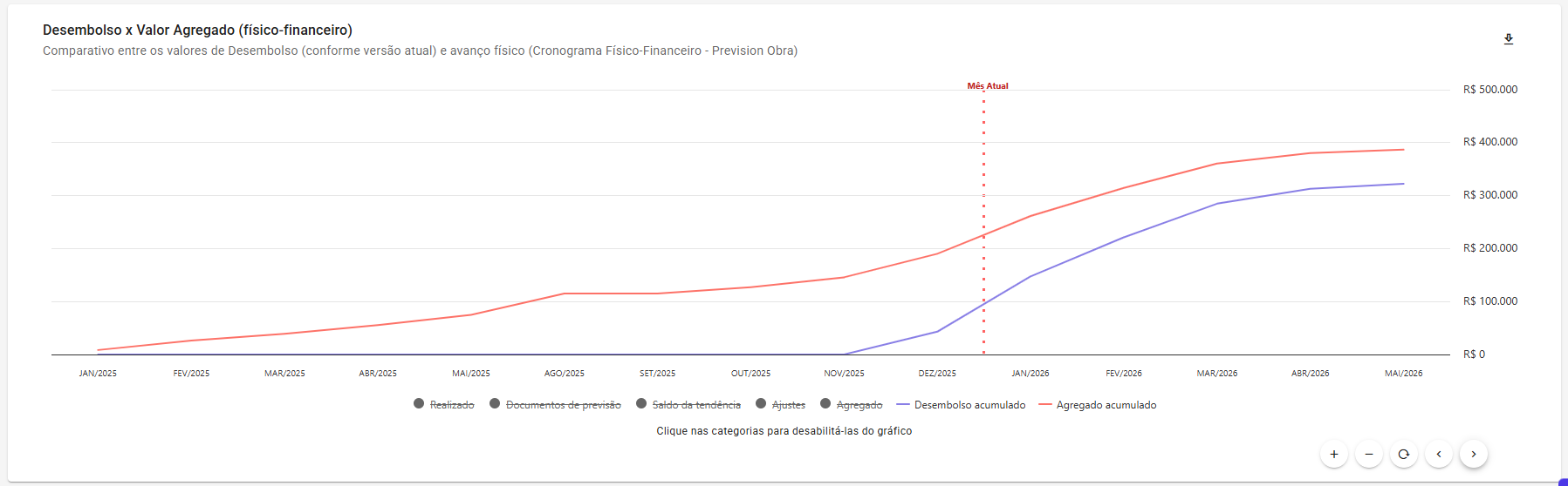 O gráfico de desembolso x agregado compara o avanço físico (valor agregado R$) com o desembolso (R$), mês a mês.