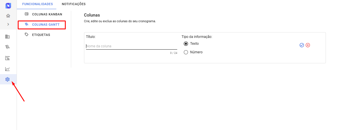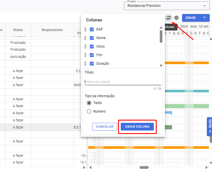 - Clique no botão "Colunas", localizado acima do Gantt.