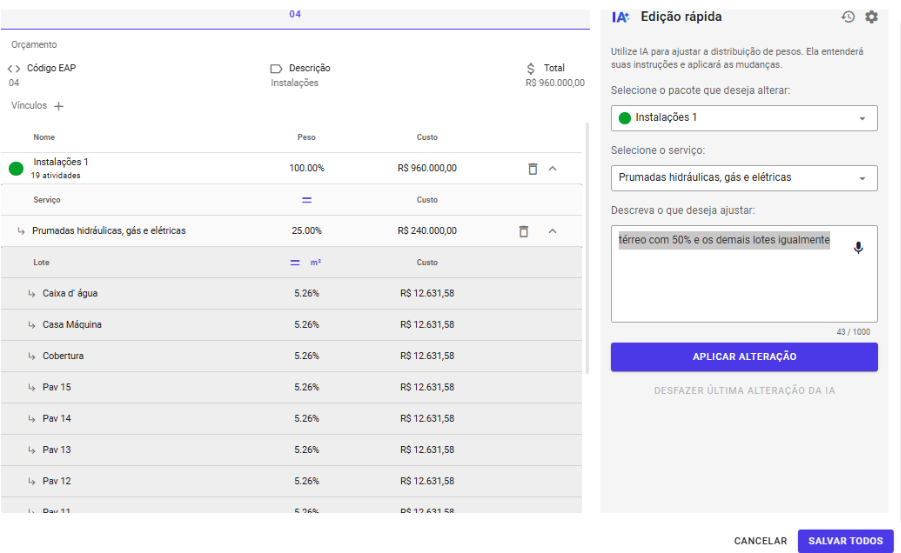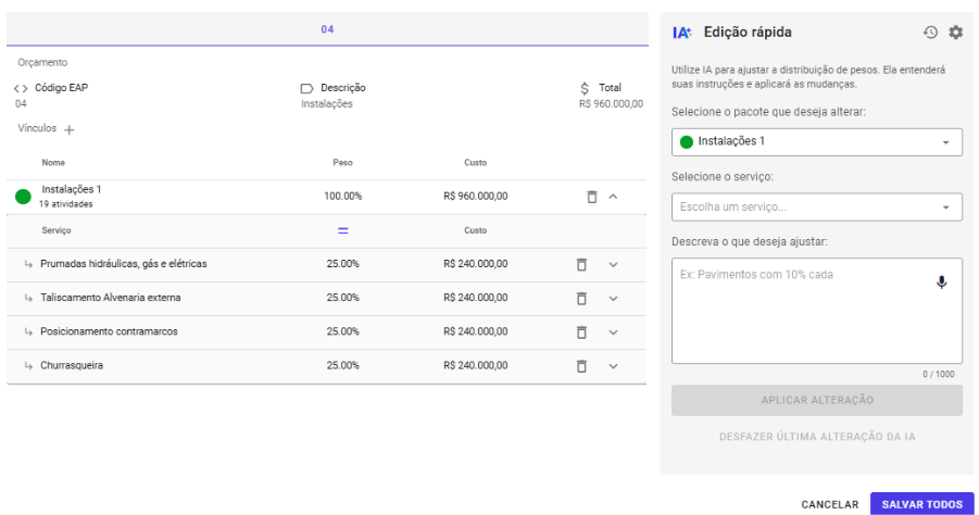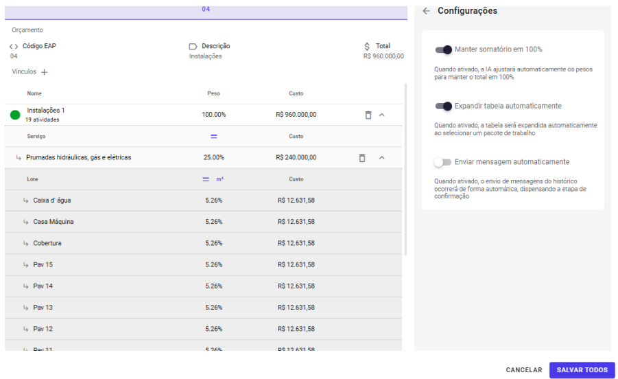 - Manter somatório em 100%: Quando ativado, a IA ajustará automaticamente os pesos para manter o total em 100%.