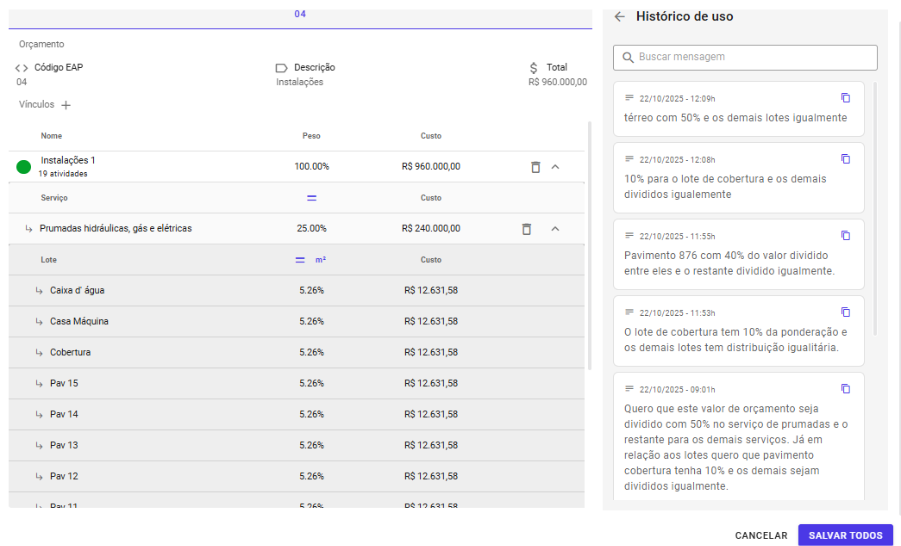 Na parte superior direita você poderá acompanhar o histórico de ponderação e reutilizar prompts caso seja necessário.