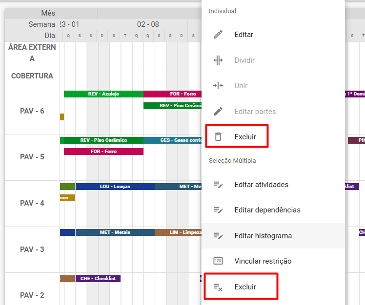 O sistema permite excluir pacotes de trabalho do cronograma em duas modalidades: