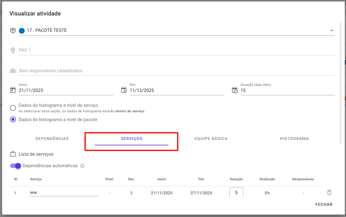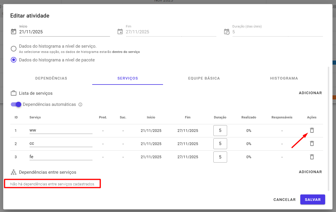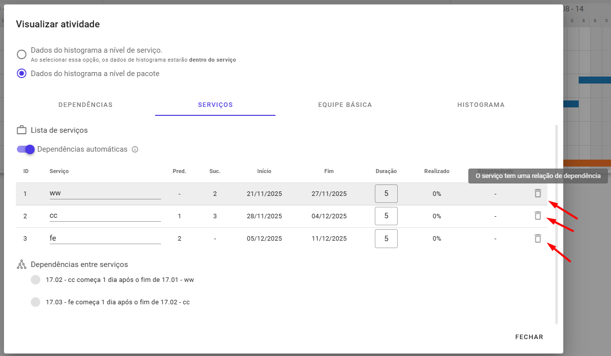 - Um aviso será exibido indicando a existência de dependências entre serviços;