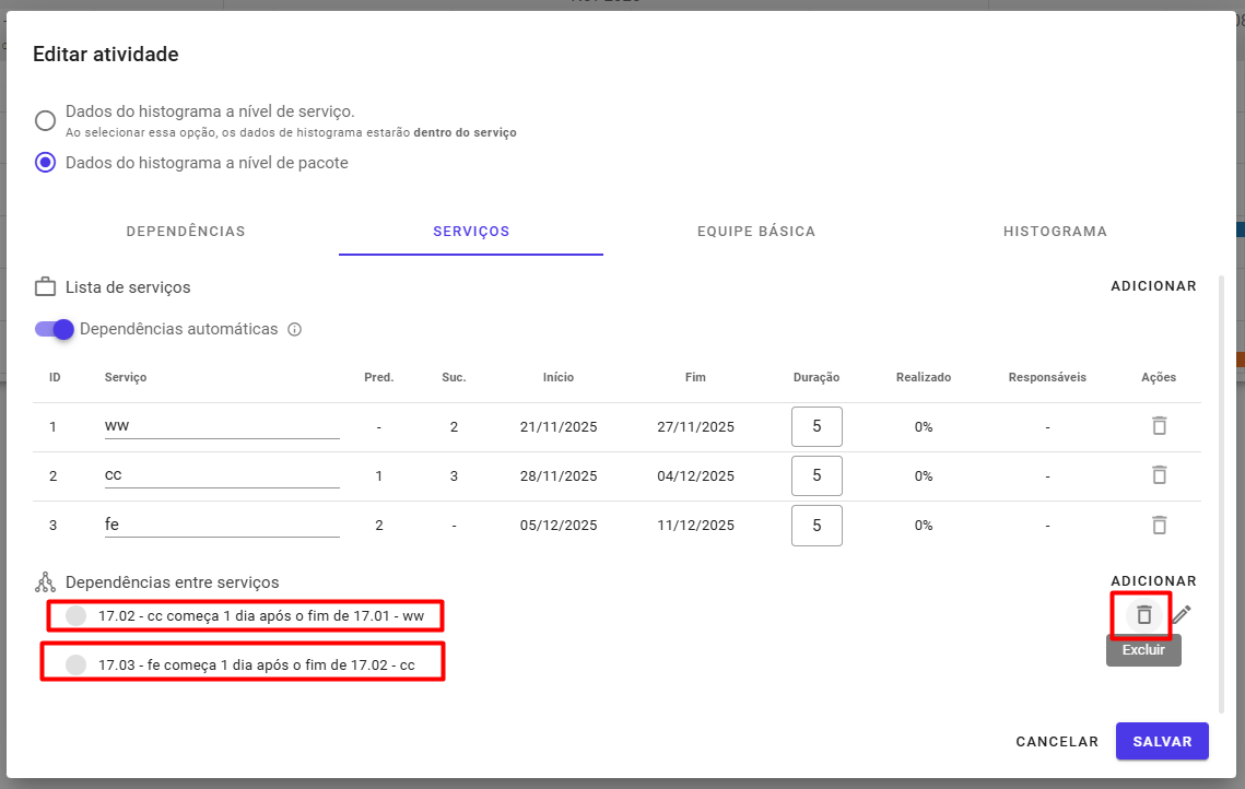 - Para liberar a exclusão, é necessário excluir todas as dependências existentes entre os serviços;