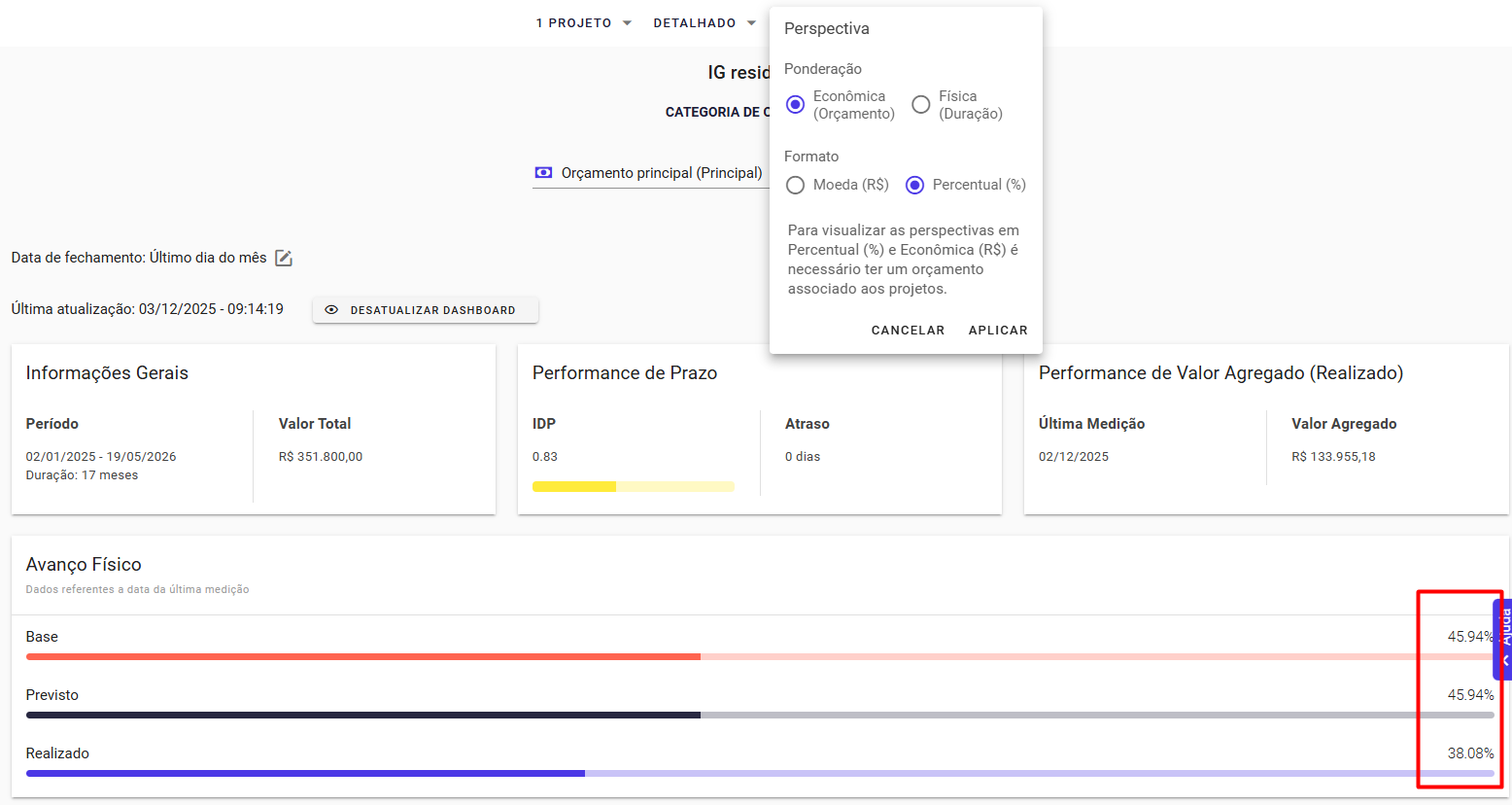 Ponderação na dashboard físico-financeira: