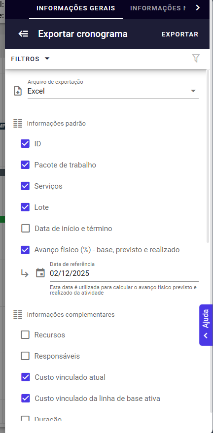 Para obter esses percentuais, nessa visão, iremos exportar o cronograma atual, com as seguintes caixas de seleção.