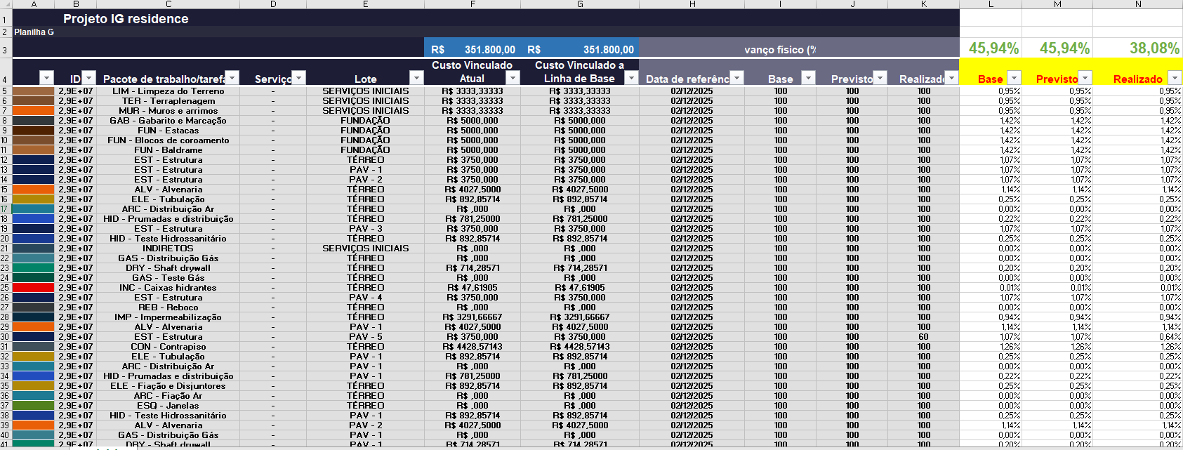 A coluna de base, previsto e realizado em amarelo e vermelho, foi criada e os valores que estão nela são os pesos ponderados de cada pacote de trabalho que se somam e resultam no avanço físico do projeto. Em anexo estará a planilha para que possa ser verificada as formulas de cada linha. Para ponderação física é o mesmo conceito, mas ao invés de usarmos a coluna de custo, iremos usar o coluna de "Durações" e aplicar o mesmo conceito.