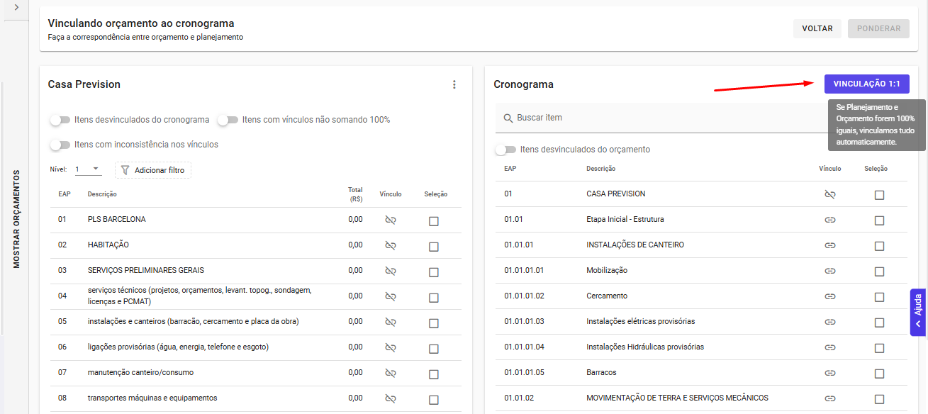 Para iniciar o processo, acesse a tela de vinculação ao cronograma e localize o botão Vinculação 1:1. Ao passar o mouse sobre ele, um tooltip será exibido explicando a funcionalidade.