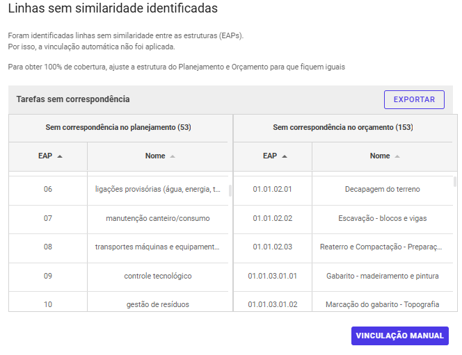 Caso existam linhas sem similaridade, uma página informativa será exibida onde permite exportar um arquivo Excel contendo os itens que não puderam ser vinculados.