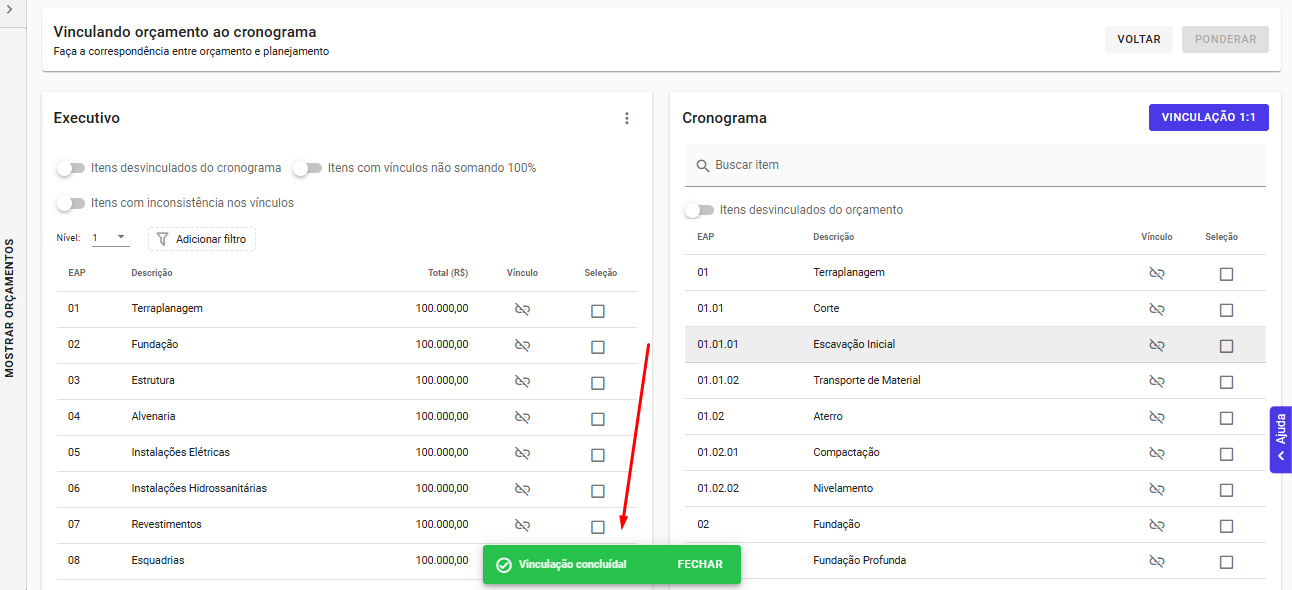 Quando o processamento finaliza, o sistema apresenta o resultado da ação. Se o cronograma e o orçamento forem 100% iguais, a vinculação será concluída automaticamente após a página ser recarregada.