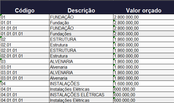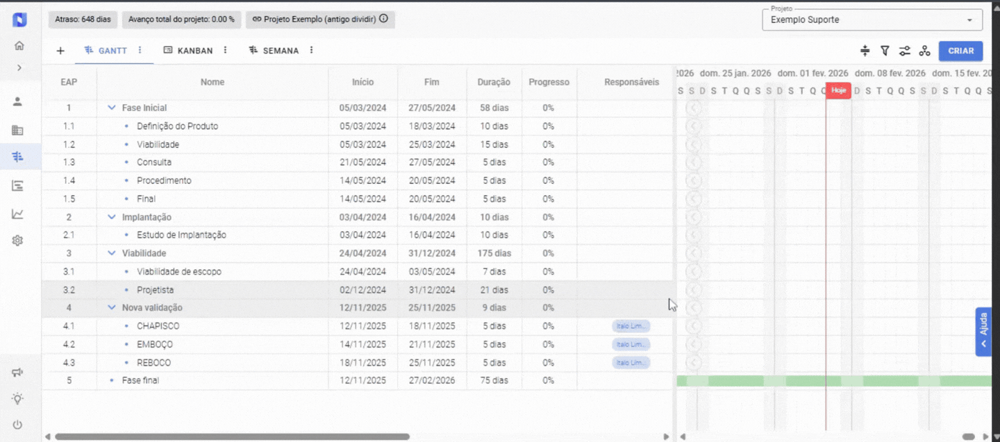 Durante a validação do arquivo, a plataforma verifica se os códigos de EAP seguem uma sequência lógica, como 1.1, 1.2 e 1.3. Caso existam linhas fora de ordem, o sistema realiza o ajuste automaticamente.