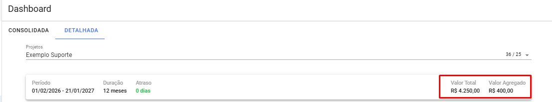 O valor total representa a soma de todos os custos do projeto. Já o valor agregado corresponde ao custo ponderado de acordo com o percentual executado das atividades.