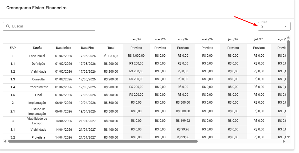 Cada orçamento importado possui seu próprio CFF. Quando há mais de um orçamento no projeto, é possível alternar entre eles por meio do seletor disponível na tela. Também há a possibilidade de expandir os níveis da EAP dentro do CFF.
