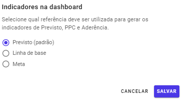 Você pode escolher entre Previsto, Meta ou Linha de Base. A opção selecionada passa a ser usada para calcular indicadores como PPC e Aderência.