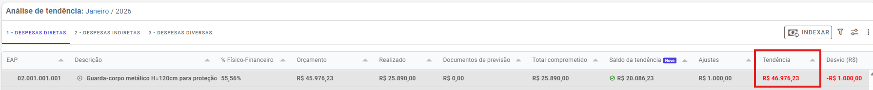 A Tendência é a projeção final do custo da obra dentro da Gestão de Custos.